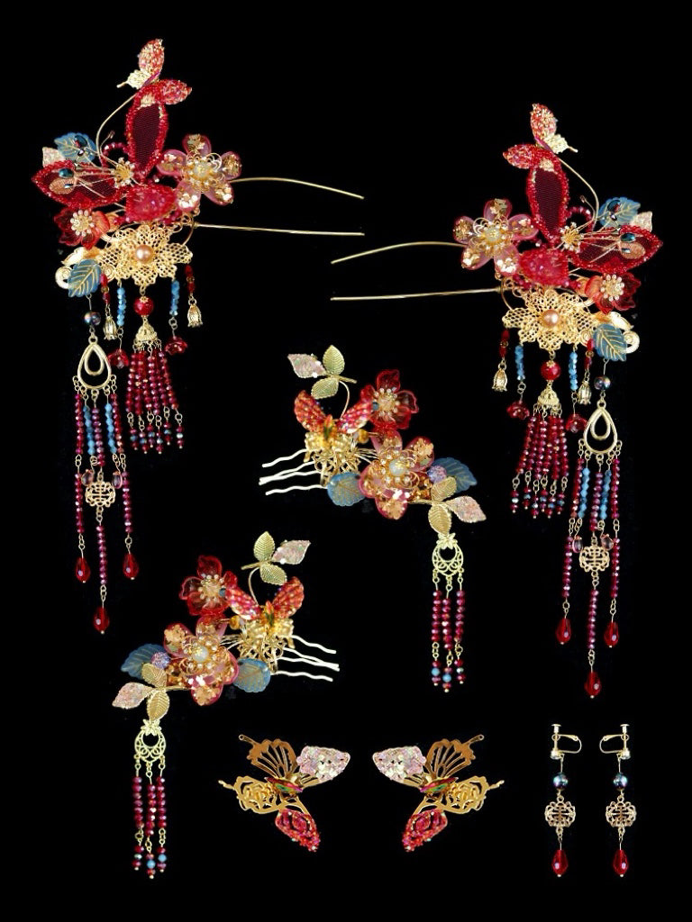 Materials: All accessories are made of color retention copper, plated with gold or sliver coating, and handmade with crystals, pearls, flower beads, and tassels.